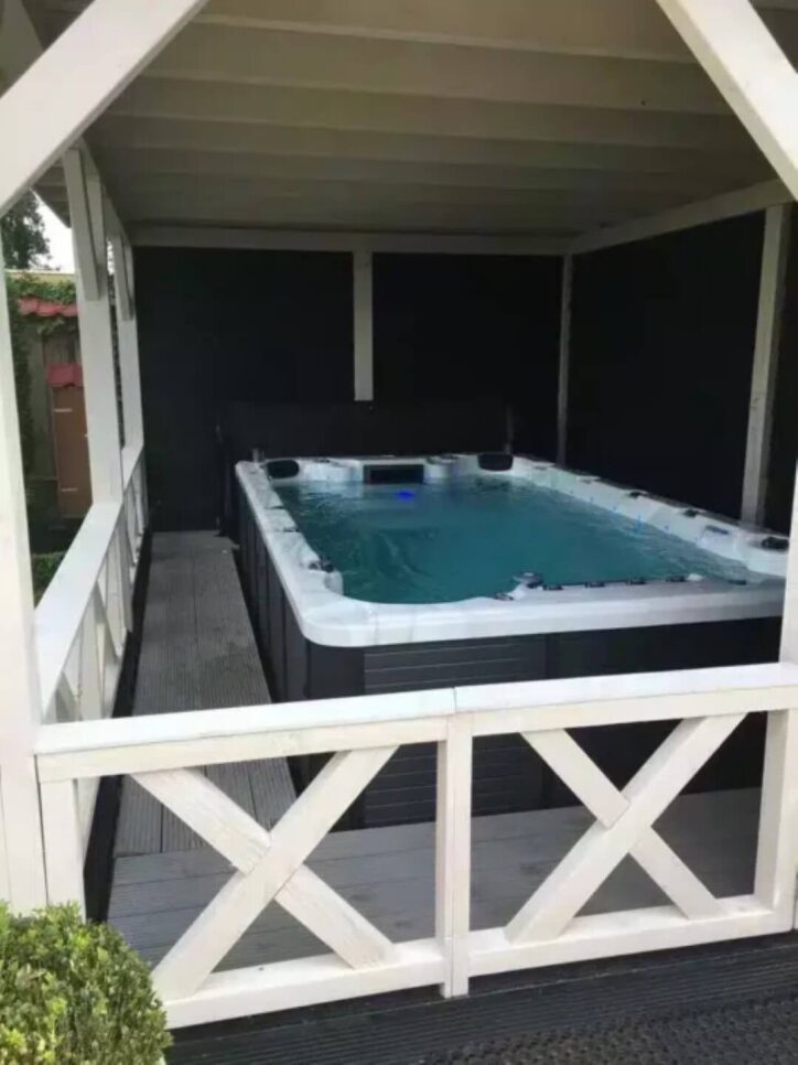 Basen przeznaczony jest dla 4 osób i oferuje przestrzeń umożliwiającą zarówno spokojny relaks w wodzie, jak i regenerację po wysiłku fizycznym.