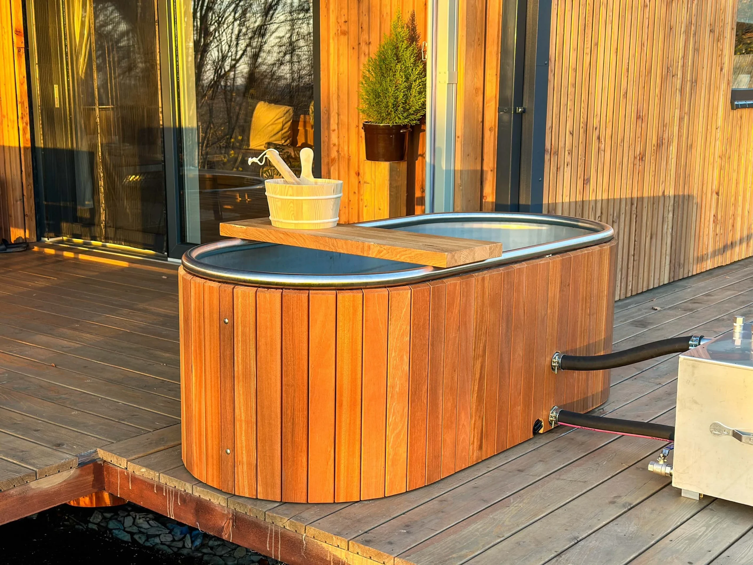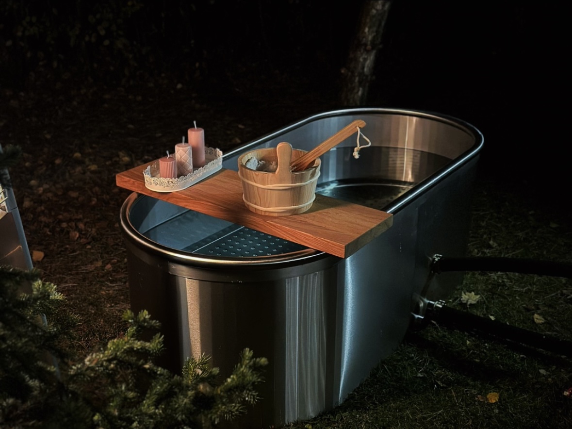 Beczki do morsowania ze stali nierdzewnej 316L. Idealne dopełnienie sauny lub strefy SPA – całoroczne, funkcjonalne i odporne na warunki atmosferyczne.